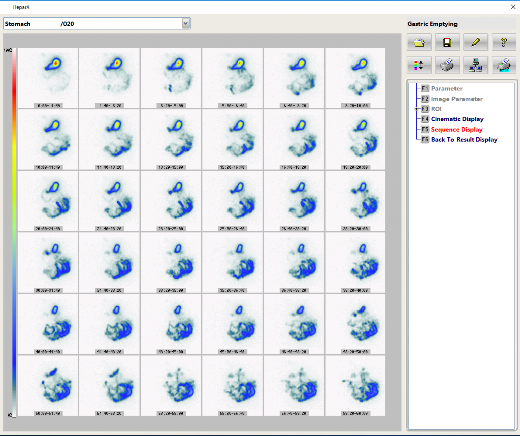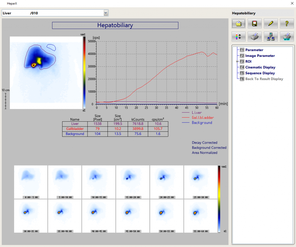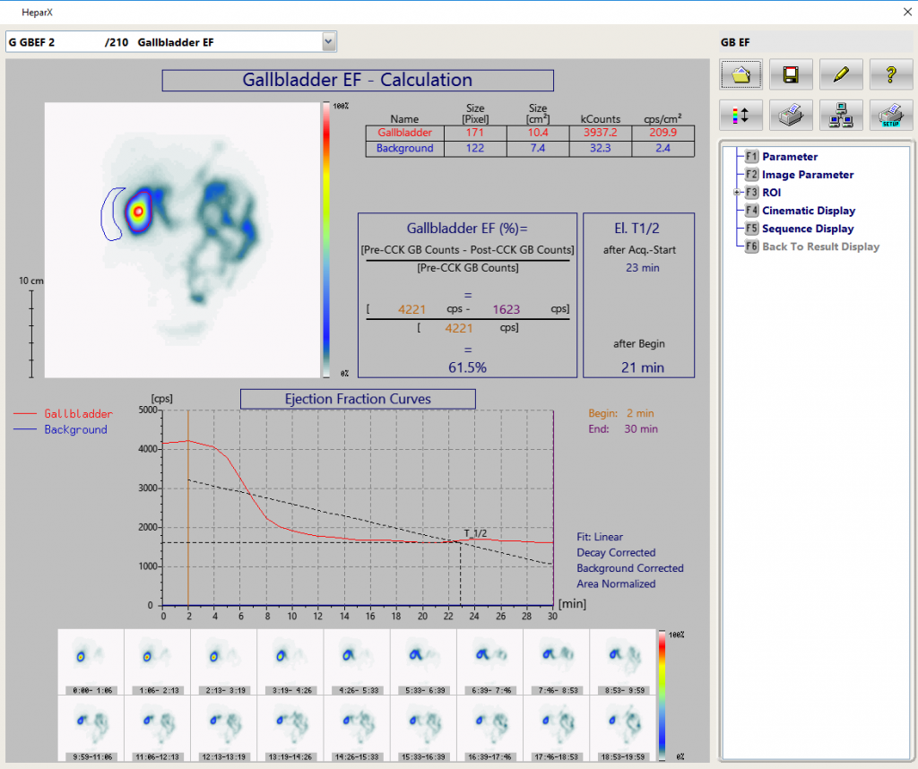 The HeparX-program is a tool to visualize and archive the hepatocellular functionality and to calculate the gallbladder ejection fraction (GBEF). The acquired studies could be displayed and printed as sequence display or for additional information in the cinematic display. The calculation of the GBEF using the immediate pre-sincalide and the post- sincalide data, regions of interest (ROI) are drawn around the gallbladder (taking into account patient motion) and adjacent liver (background). The GBEF is calculated from the gallbladder time-activity curve of the dynamic study.