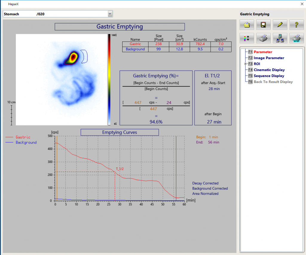 Dynamic Gastric emptying studies can be processed and the emptying curve as well as curve parameters will be displayed.