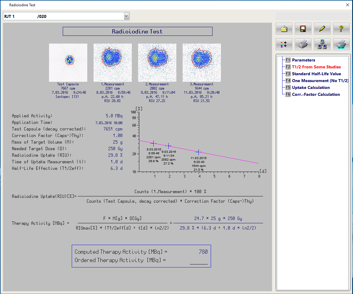 The radioiodine test program is used to calculate a recommendation of the therapy activity using the uptake of a I-131 test capsule measured by a gamma camera.