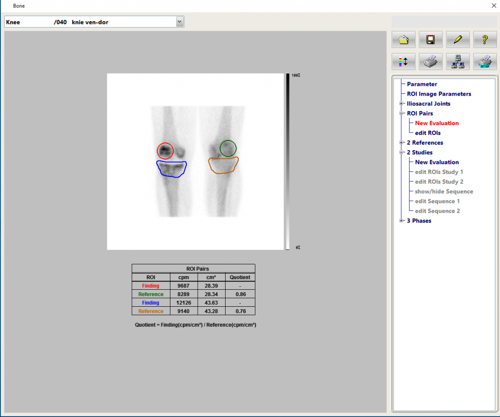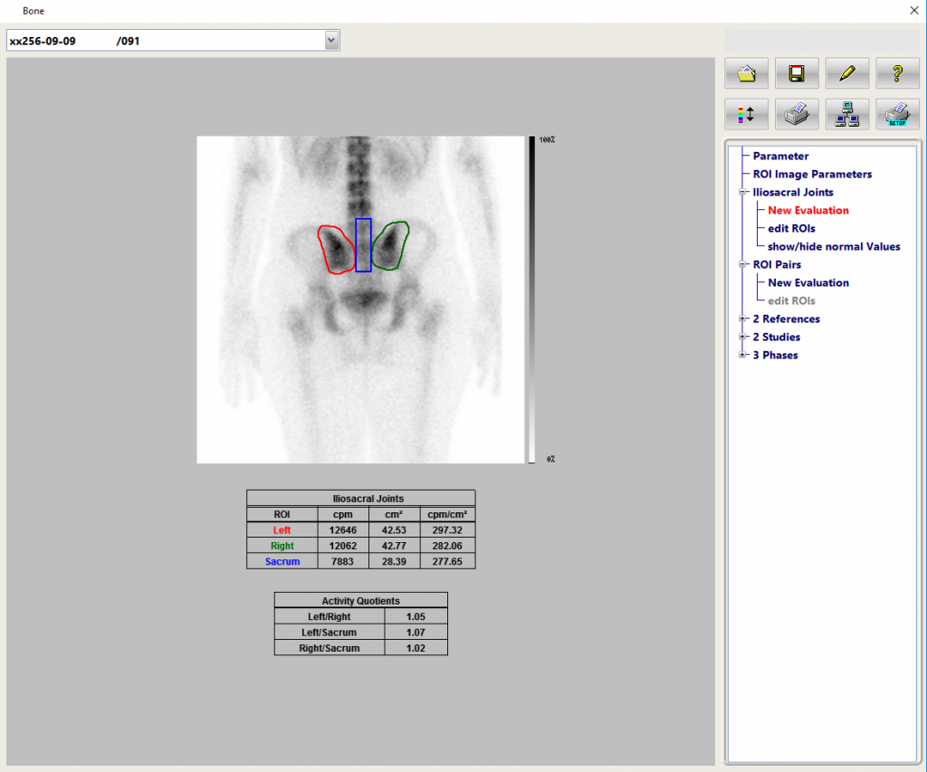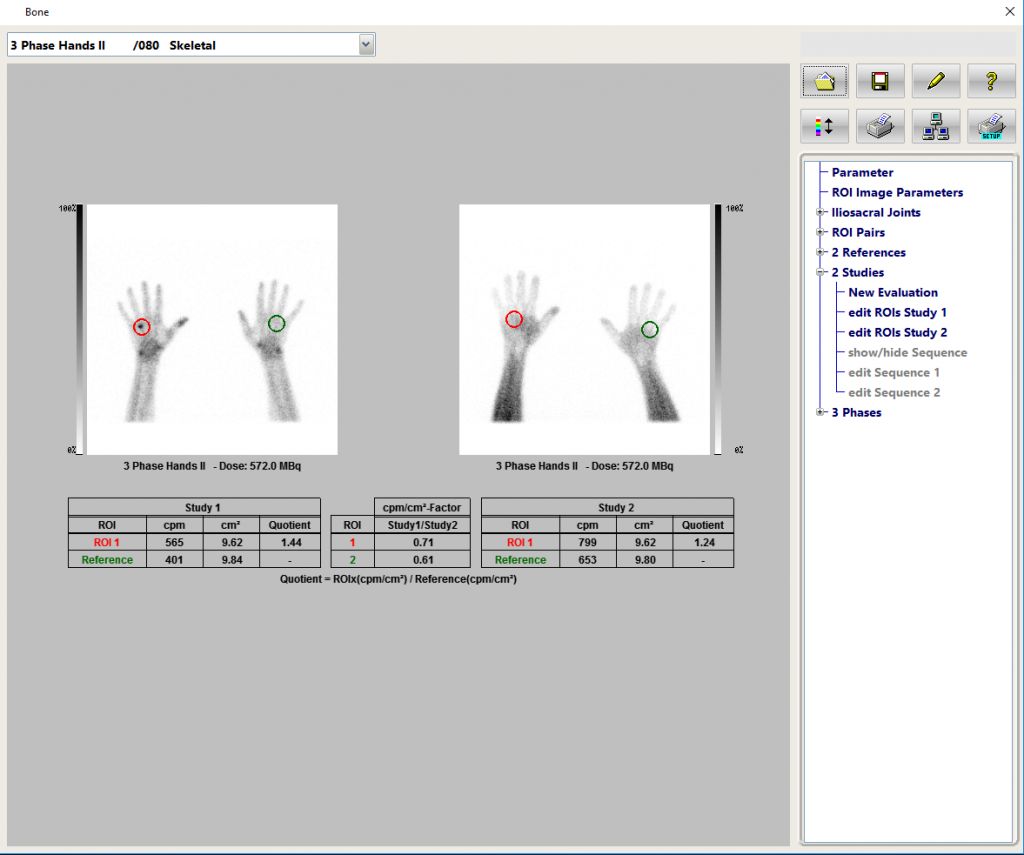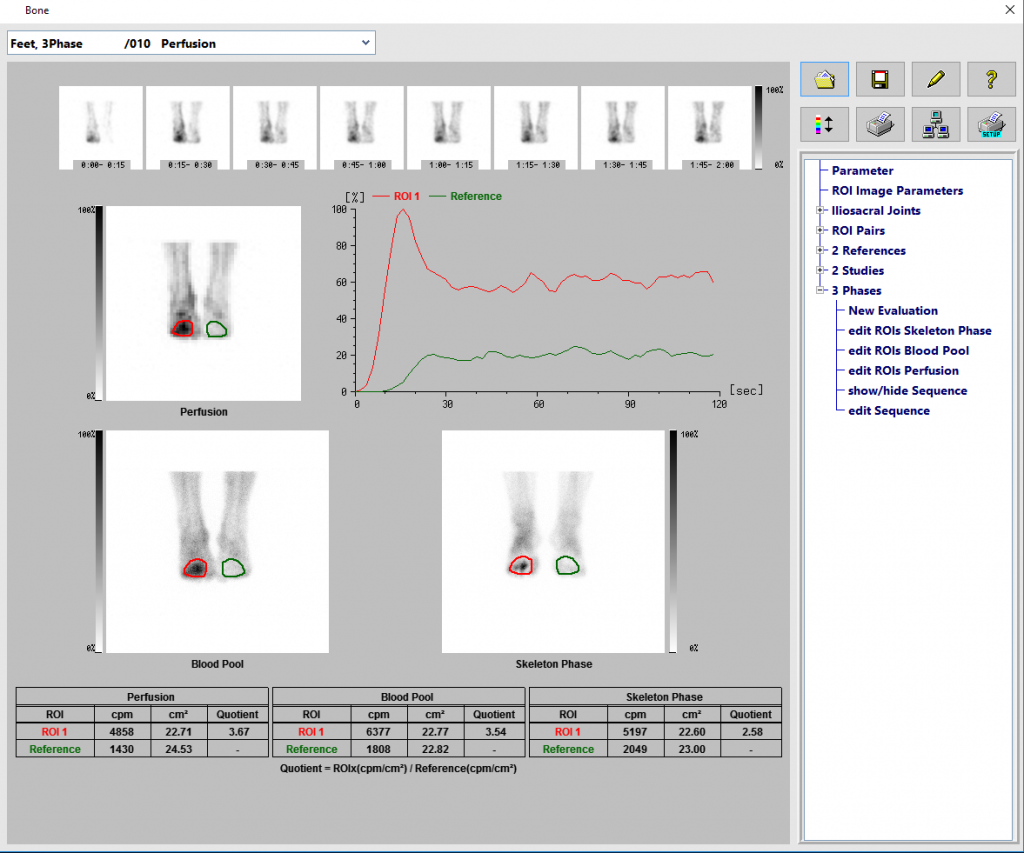 このタスクは、3phase骨シンチグラフィーでROI技術を使用して、疑わしい領域を通常の領域と比較します。 フローフェーズは、ボーラス注入後の収集です。ボーラスフェーズの直後にある血液プール、単一画像のスタティック収集。骨格位相画像は2〜3時間後に収集されます(現地の慣習による)。