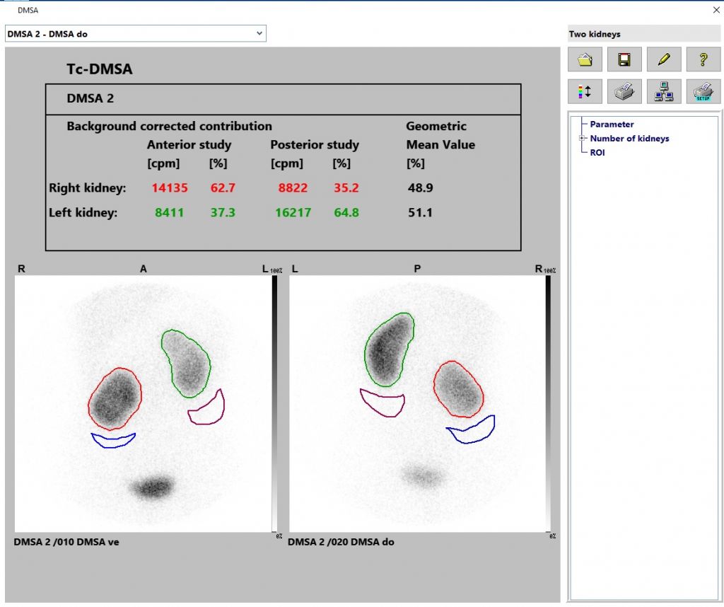 DMSAプログラムは、腎臓における放射性トレーサーの分布を表示し、L / R関係を計算するために使用されます。